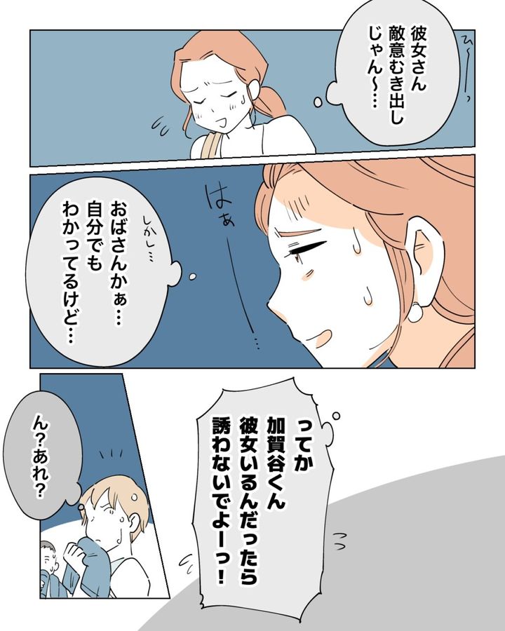 「彼女さん敵意むき出しじゃん~・・・」先ほどの彼女さんの態度に明らかな敵意を感じ取った私。そして、「おばさんじゃん」と言われた言葉を思い出し「おばさんかぁ・・・自分でもわかってるけど・・・」と分かっていることだけど言われるとやっぱり落ち込んでしまう。「ってか、加賀谷くん彼女いるんだったら誘わないでよーっ!」彼女さんも来ると分かっていたら来なかったのに・・と思いながら飲み物を買いに向かった私でした。