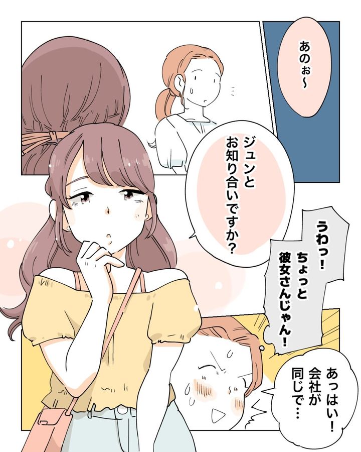 すると、見覚えのある女の子が「あのぉ~。ジュンとお知り合いですか?」と声をかけてきました。すぐに加賀谷くんの彼女だと気付き「うわっ!ちょっと彼女さんじゃん!」と思いながら「あっはい!会社が同じで・・・」と焦りながら答えました。