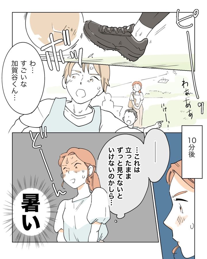 試合が始まり、コートを縦横無尽に走り回る加賀谷くんを見て「わ・・・すごいな加賀谷くん」と感心しながら見ていた私。しかし、10分後。「・・・これは立ったままずっと見てないといけないのかしら・・・暑い!」暑いし足が疲れてきたけれど、周りはみんな立っているし、こういう場に慣れていない私は勝手が分からない。