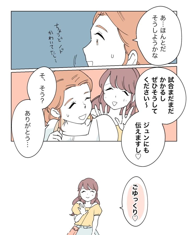 「あ・・・ほんとだ。そうしようかな。ちょうどノドかわいてたし・・・」飲み物を買いに行こうとする私に彼女さんが「試合まだまだかかるし、ぜひそうしてください~。ジュンにも伝えますし」と急かすように言うので「そ、そう?ありがとう・・・」とお礼を言って飲み物を買いに行きました。彼女さんは満足そうに「ごゆっくり」とにっこり。