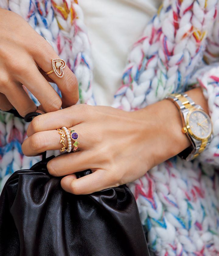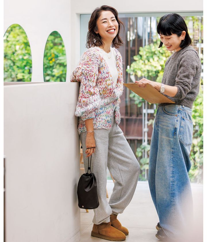たくさん人に会う日はポップなニットを主役に 社交性もアップ。『潮海さんのサロンで定期的に開催。よく動くのでニットにスウェットで可動域を広く。ジュエリーを重ねづけして色も取り入れます』