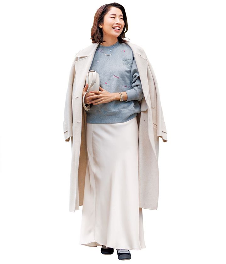 ランチ初めはクリアな気持ちで臨みたいからホワイトコーデ一択。『ホテルといえども通い慣れた場所だからこそ抜け感が出せるスウェットで。ドレープがキレイなスカートは必ず褒められる一着です』