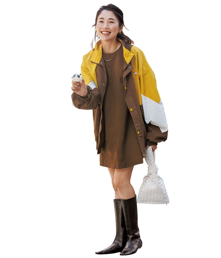 スポーティカジュアルなら 高校生の姪っ子にも大好評♡ 『食べ歩きもするので楽ちんなワンピが主役。ヘアは快活なイメージのゆるいハーフアップに。ブーツもトレンドのブラウンで統一』