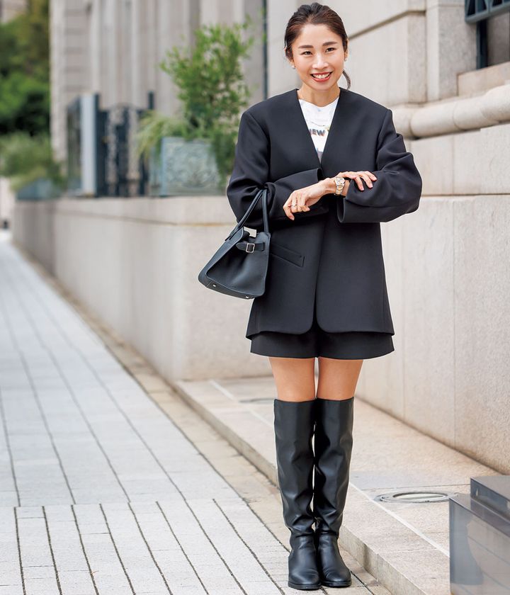ジャケットは ショーパン×ニーハイブーツでモードにイメチェン。『オシャレな母とのお出かけは何げに気合いが入るので、ノーカラージャケットと同色のショートパンツでセットアップ風に仕上げます』