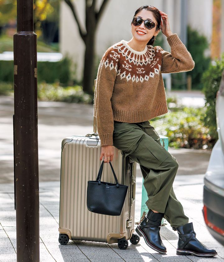 温泉コーデは 海外スナップのアーミースタイルがお手本。『数年前に購入したセリーヌのニットは個性的な柄が可愛くお気に入り。エンジニアブーツとサングラスでハードさも忘れません』