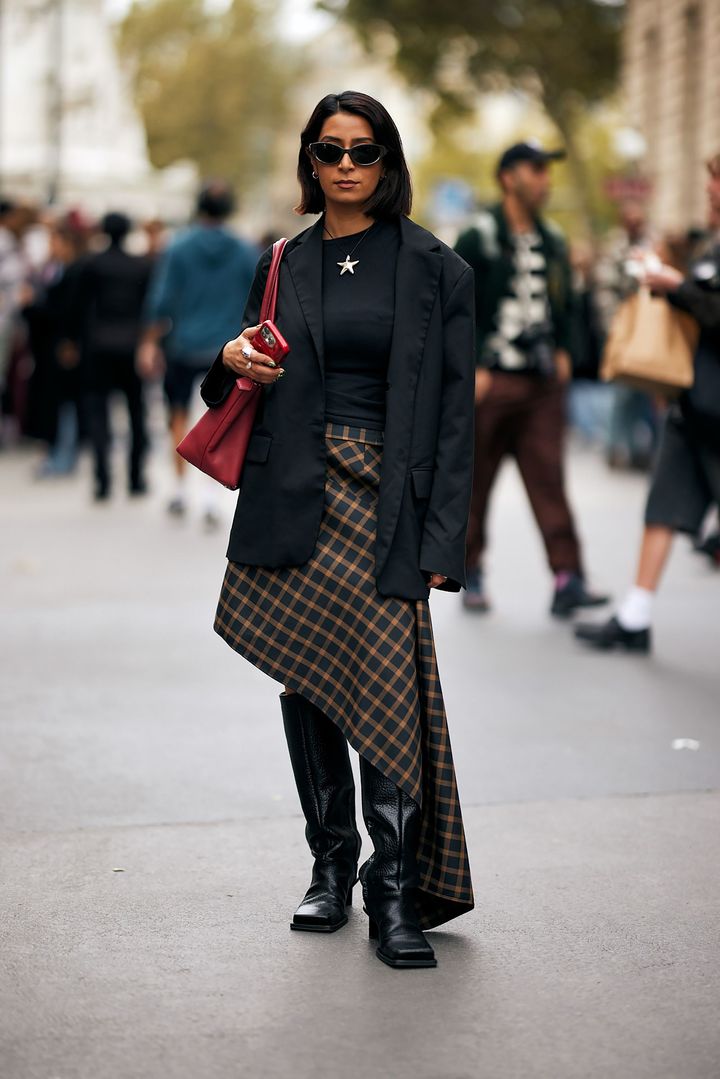 チェックスカートは合わせ方とカラー次第で、オフィスルックにも取り入れられるかもしれない。落ち着いた色合いのアシンメトリースカートをピックアップし、ブラックのテイラードとロングブーツを合わせることで、パンキッシュな印象を抑え、きちんと感を演出。スマートフォンケースとバッグのマットなレッドが程良いアクセントを効かせているのもポイント。