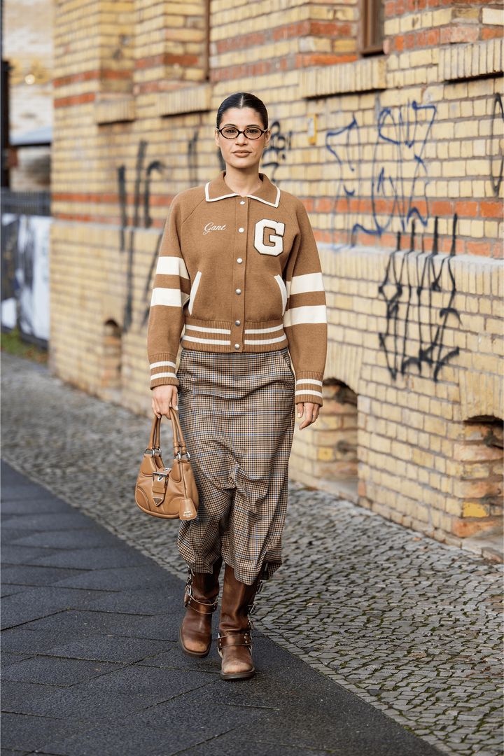 ここまではややエッジィなスタイリングを紹介してきたが、ブラウン系の細かいチェックかつミディ丈のスカートを選べば大人カジュアルにもフィットしてくれる。スナップのように、トップ、ブーツ、バッグなどにトーンの違うブラウンを採用し、絶妙なバランス感のグラデーションを実践したいところ。