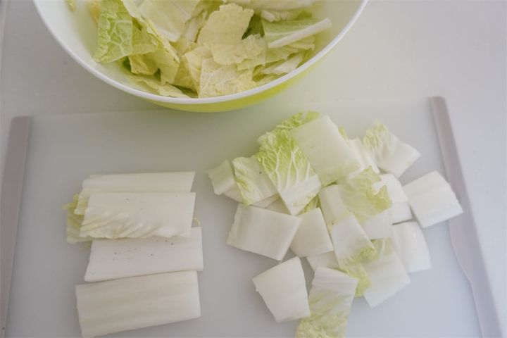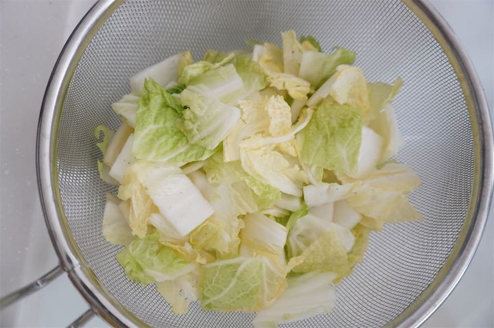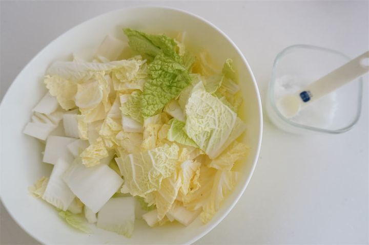 2.白菜に塩をまぶして、10分ほど置いて水気を切る。
