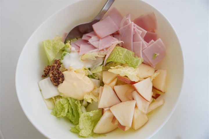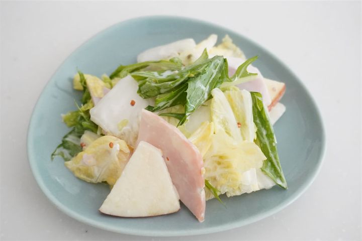 3.白菜、りんご、ハム、[A]の調味料を、ボウルに入れて混ぜたらお皿に盛る。最後に2~3cm長さに切った水菜を飾る。