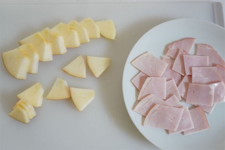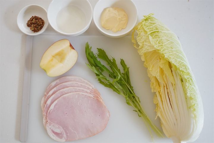 1.白菜とハムはひと口大に切る。りんごは皮付きのまま、薄いいちょう切りにする。