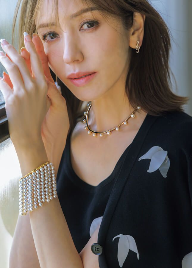 バングル¥193,600、パールピアス¥48,400、ト音記号ピアス¥240,900/以上ビジュードエム (ビジュードエム六本木ヒルズ店) チョーカー/美香私物 ノースリニット¥27,500、カーデ¥38,500/ともにラインヴァンド(エンメ)