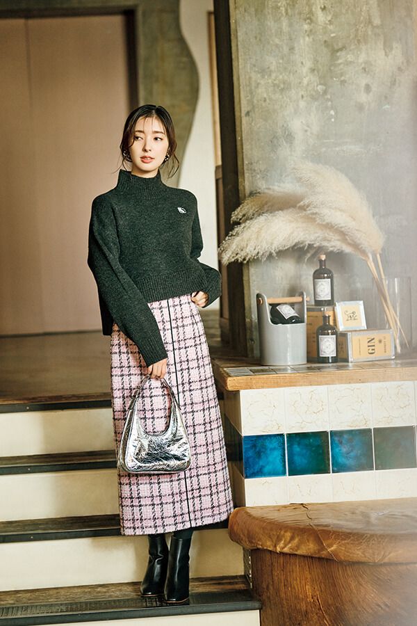 チャコールニットとピンクツイードの組み合わせもキャッチーで可愛い。ニットの胸元にはキュートなネコちゃんの刺しゅうも♡