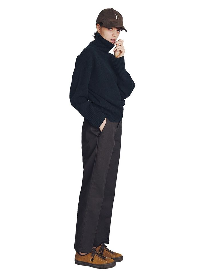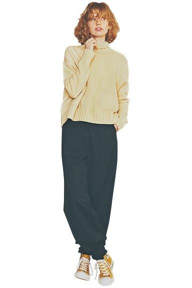 やさしいイエローからつなげるように、首元からフリルをチラ見せ。ざっくりとした厚手のニットにもニュアンシーな立体感が生まれ、シンプルながらも凝ったスタイルが完成。