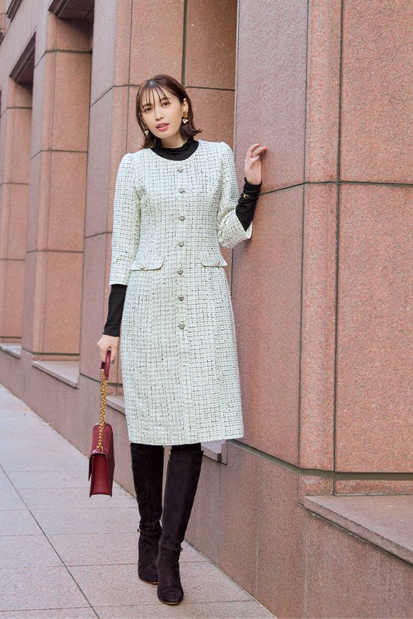 ラメ入りのツイードがリッチフェミニンなツイードワンピなら今年らしさも華感も◎。カメリアモチーフのボタンがリッチシックなアクセントに。足元のロングブーツでクラシカルなツイードワンピに遊び心をひとさじ加えて。