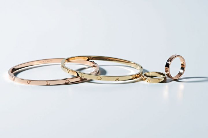 「ブルガリ・ブルガリ」右からリング〈PG〉¥169,400〈YG〉¥169,400 ブレスレット〈YG〉¥594,000〈PG〉¥594,000(すべてブルガリ/ブルガリ ジャパン)