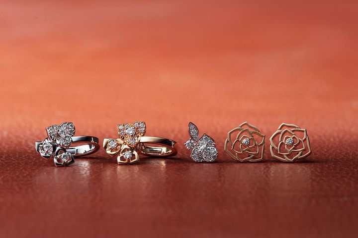 「ピアジェ ローズ」右からピアス〈PG×D〉¥211,200 シングルピアス¥316,800 イヤーカフ〈PG×D〉¥358,600〈WG×D〉¥382,800(すべてピアジェ/ピアジェコンタクトセンター)