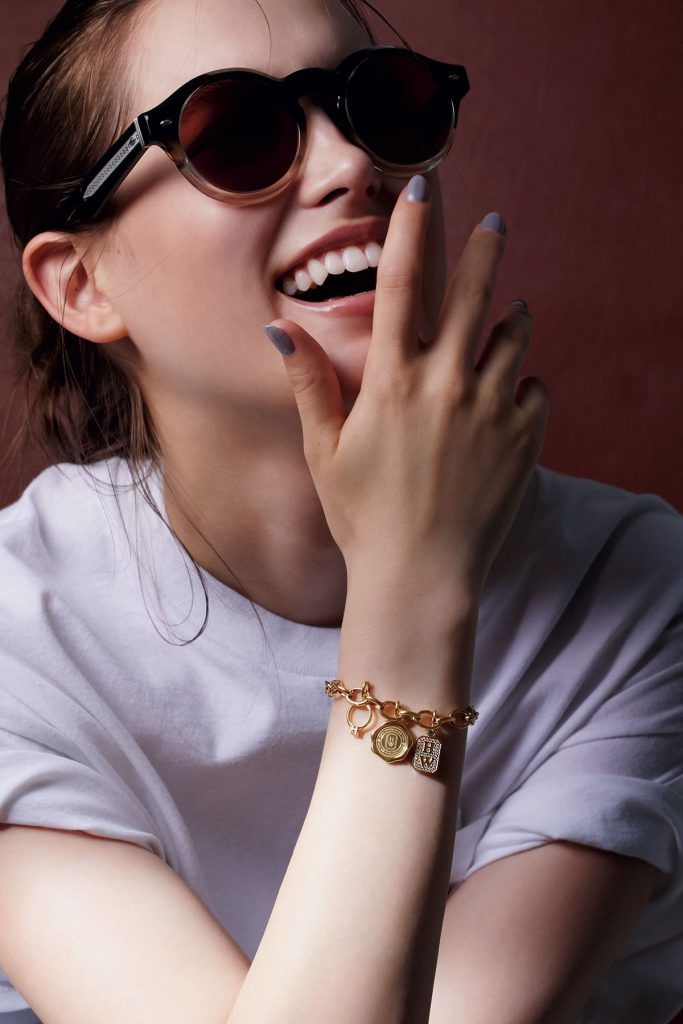 「チャーム・コレクション」〈YG×D〉HWロゴ・チャーム¥1,056,000 シールド・チャーム¥429,000 HWリング・チャーム¥506,000 ブレスレットチェーン〈YG〉¥671,000(すべてハリー・ウィンストン/ハリー・ウィンストン クライアントインフォメーション)サングラス¥46,640(オリバーピープルズ/ルックスオティカ ジャパン カスタマーサービス)Tシャツ¥7,700(オリジナル チャコール/チャコール トーキョー)