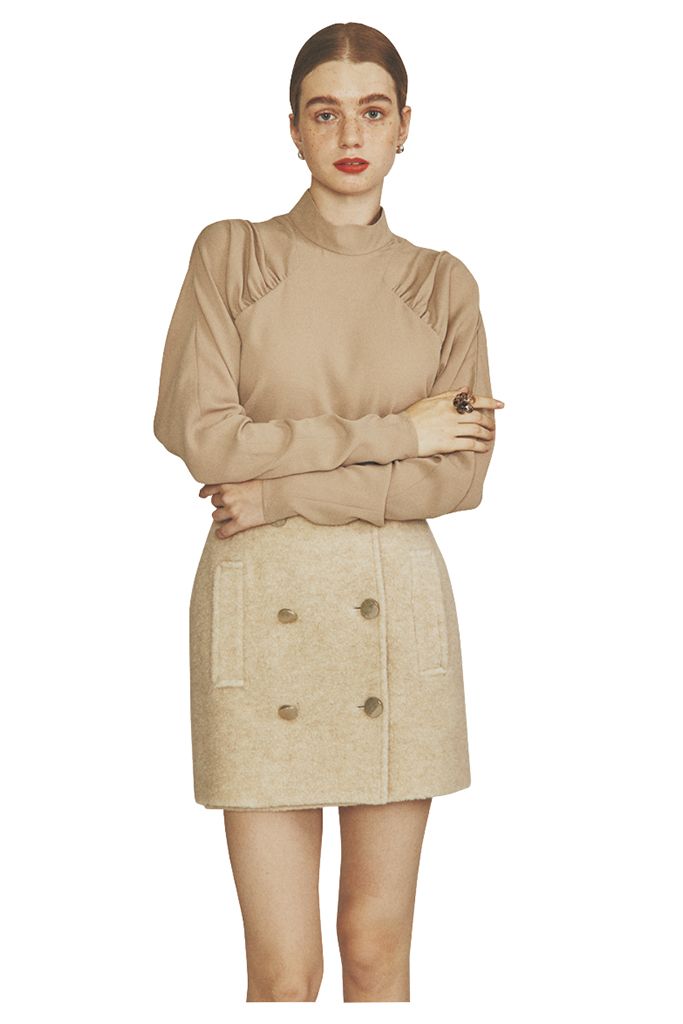 身ごろはシンプルで肩やそでだけがボリューミィなデザインが旬。両脇にほどこされたデザイン性の高いギャザーで、肌になじみながらも埋もれないベージュ。落ち感のある素材が女っぽさを助長。 ベージュブラウス/ベイジ,(オンワード樫山 お客様相談室) スカート/イン(ショールーム リンクス)