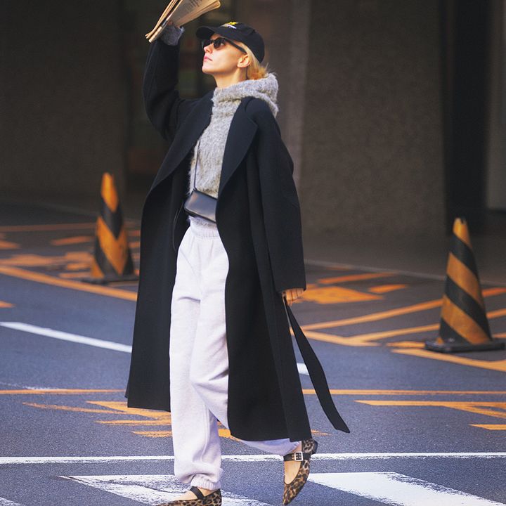 後ろ姿にも変化をもたらすフードつき。特殊起毛をかけて表情を出した、贅沢なシャギーの風合い。フロントボタンのないガウンコートに、質感と丈で抑揚を添えてくれる。 グレーハイネックシャギーニット/ワイドットバイノルディスク(ノルディスク アパレル) グレースエットパンツ/ユナイテッドアスレ(キャブ) 黒ロゴキャップ/原宿シカゴ 神宮前店 レオパード柄シューズ 17,600円/ダイアナ(ダイアナ 銀座本店)