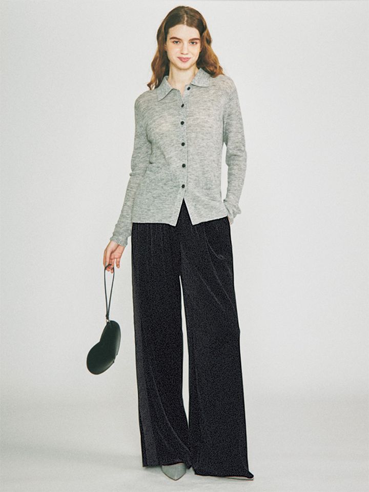 曖昧な色でものっぺり見えない、ニュアンスのあるグレー。ほどよくフィット感のあるニットのリブも相まって、普通のシャツとはまた違う抑揚のある見た目に。カーディガンらしく羽織りとしても長い期間着られる。