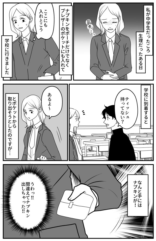 制服のブレザーのポケットに生理用ナプキンを入れて学校へ行った私。男子生徒に「ティッシュ持ってない?」と聞かれ、ポケットから出そうとしたところ……。