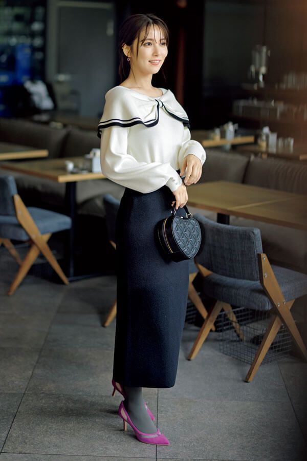 ニット¥4,290/tocco closet スカート¥7,990/UNFILO(オンワード樫山) ピアス¥173,000/マリハ バッグ¥7,920/RANDA タイツ¥1,100/満足(福助) 靴¥18,150/ダイアナ(ダイアナ 銀座本店)