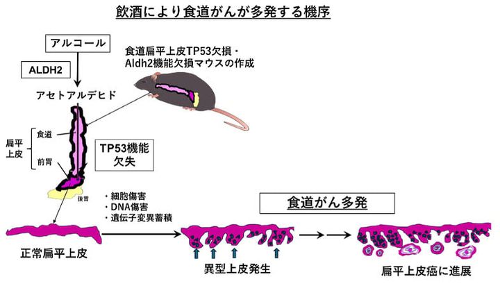 これまで疫学的には「飲酒と食道がんの関係」は知られていましたが、それが実際にどのように発生するのかを動物モデルで証明したのは、今回が初めてです。