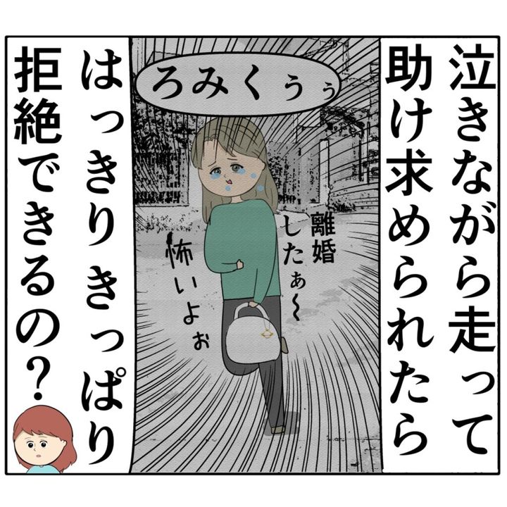 これまでジュリ実さんに頼られたときに断ることが出来なかったろみ緒さんを信用しきれないめいさんは「離婚して泣きながら走って助け求められたら、はっきりきっぱり拒絶できるの?」と問い詰めました。