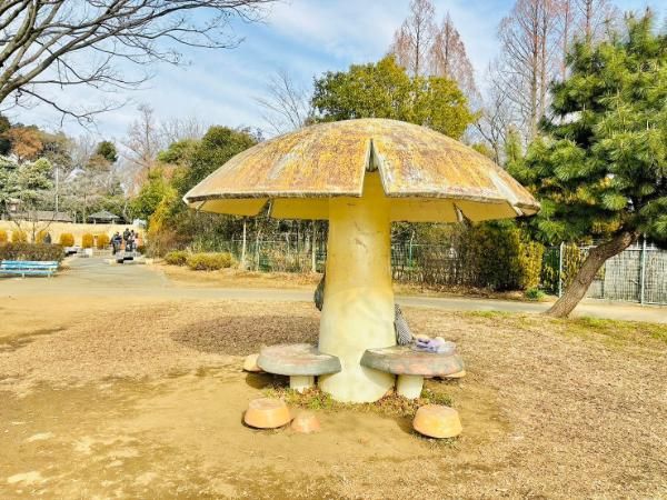 こちらはキノコの形をしたベンチ♪ 屋根の部分も大きなキノコになっていて、これは写真を撮らずにはいられませんでした♪