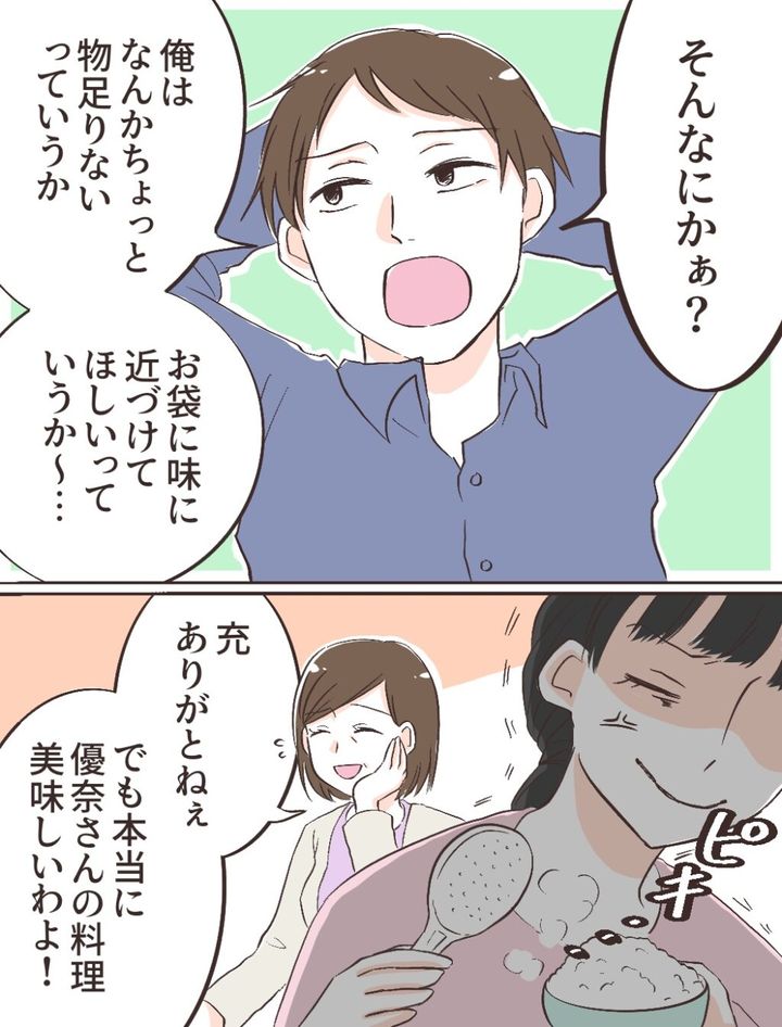 お義母さんも息子の言葉にまんざらでもないような感じで「充、ありがとうねぇ、でも本当に優奈さんの料理美味しいわよ!」と言っており、優奈さんは怒りを抑えるのに必死でした。