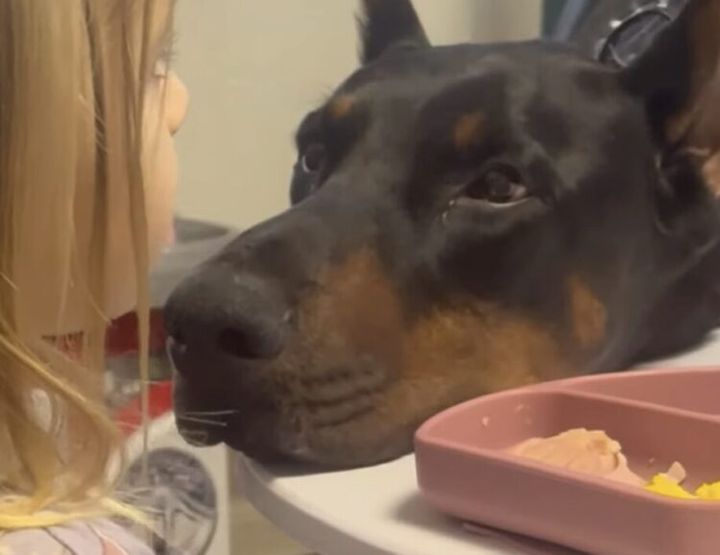 「そろそろ遊ぶ時間だよね?」じーっと待つドーベルマンさんの視線が熱い