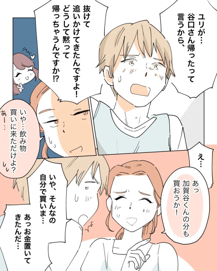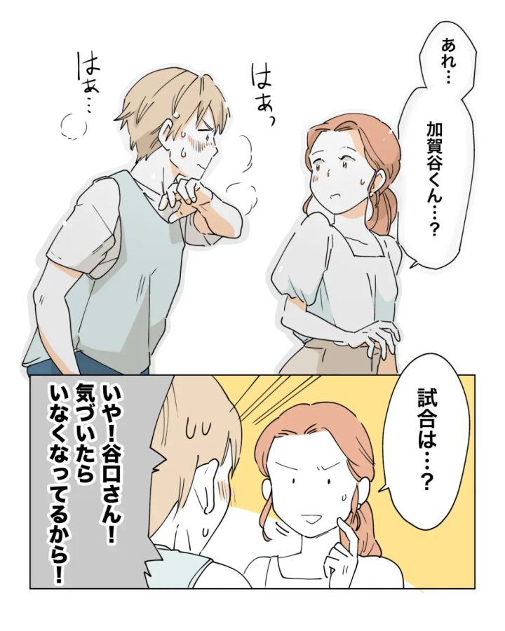 ユリちゃんから私が帰ったと聞いて、加賀谷君は試合を抜けて追いかけてきたようです。「飲み物買いに来ただけよ?」と言いながら、ユリちゃんの態度を思い返して察した私です。