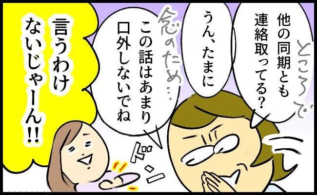 A子のユーモアのあるアドバイスや、いずれ先輩とは異動で違う部署になるという言葉に少し救われた私。A子はすでに会社を退社しているため、先輩社員と関わることはありません。しかし、時々連絡を取っている他の同期もいるそうで、先輩社員のことはあまり口外しないでほしいと念押しをすると「そんなこと言うわけないじゃん!」と言われました。