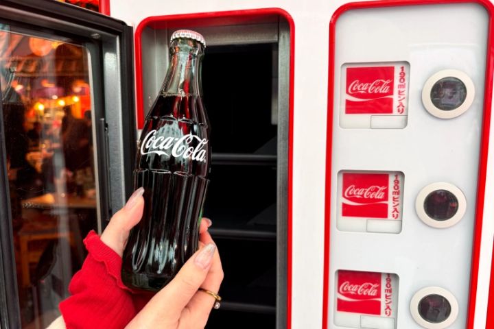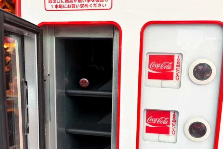 レトロな自動販売機を実際に操作して「瓶コーク」を購入することができます。