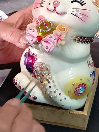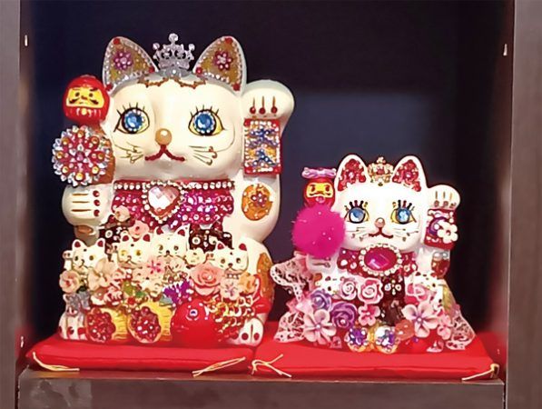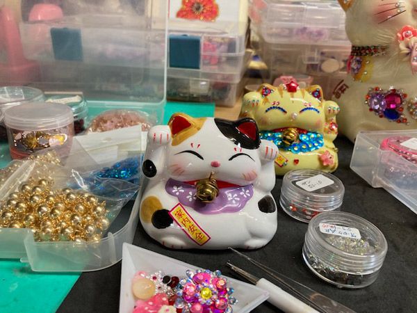 ジュエリーデザイナー・千手(せんじゅ)あずささんが陶器製招き猫にスワロフスキー・エレメントやガラスストーン、アクリルストーン、リボン、スパンコールなどで飾る“デコ招き猫”が人気。 始めたきっかけは、「お店舗にレンタルBOXを置いていた時、いろいろな物をお店に持ってこられたので、じゃあ私も自分も何か置こう、と思ったから」とのこと。 工房には光り輝くカワイイ猫ちゃんたちがズラリと並び、キラキラ好きにはたまりません!ネットでも購入できますが、オーダーを受けるとその人のイメージ、好み、要望を聞いてアレンジしているとのことなので、実際に見て、あずささんと話して、オーダーするのがおすすめです。