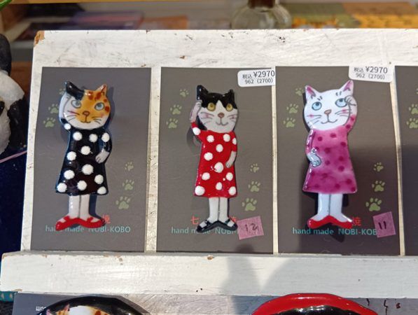看板猫モデルの作品もあります。左はキヨちゃんがモデルの七宝焼のブローチ(2970円)
