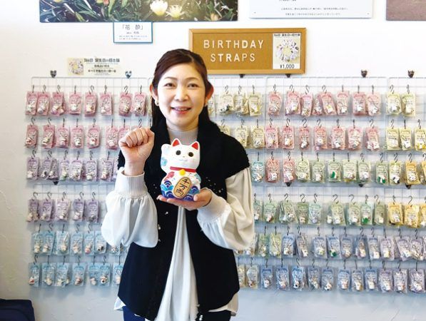 手に持っているのは、招き猫の貯金箱。オーダーで作れる貯金箱もあります。後ろの壁にかかっているのは、招き猫のバースデーストラップ!