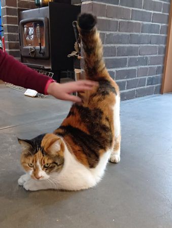 暖炉のそばでくつろぐ看板猫・キヨちゃん