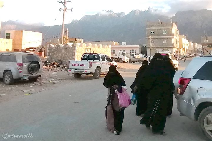 厳格なムスリムが多い中東イエメン。ここソコトラ島も例にもれず、とくに首都で暮らす成人女性は、眼以外を真っ黒な衣裳のアバヤとニカブですっぽり覆い隠して出歩いています。