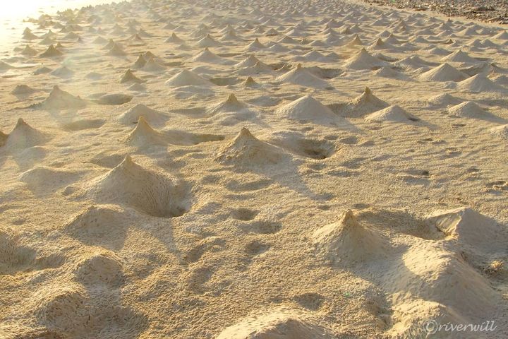この正体は、前述で紹介したソコトラ島固有種の黄色のカニの仕業で、巣穴に潜るために掻き出した砂で生まれた奇跡の光景。ちなみに、このビーチでは、夜は夜光虫による青い光の波も見ることができます。