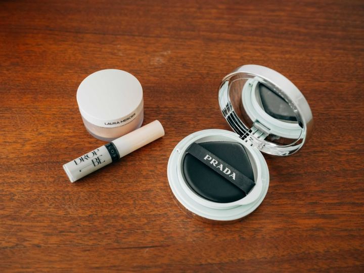 プラダ ビューティのクッションファンデでツヤ感のある土台づくりを。パウダーはテカリを抑える程度に控えめに。