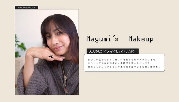 佐田真由美さんは、ハンサムな大人のピンクメイク。今やピンクは可愛いだけじゃない! 全体のトーンを統一させ、色みを引き算して取り入れることでじゅわっとセンシュアルな印象に。素肌感を残したベースに女性らしいリップラインを掛け合わせることで凛とした女性像を演出して。