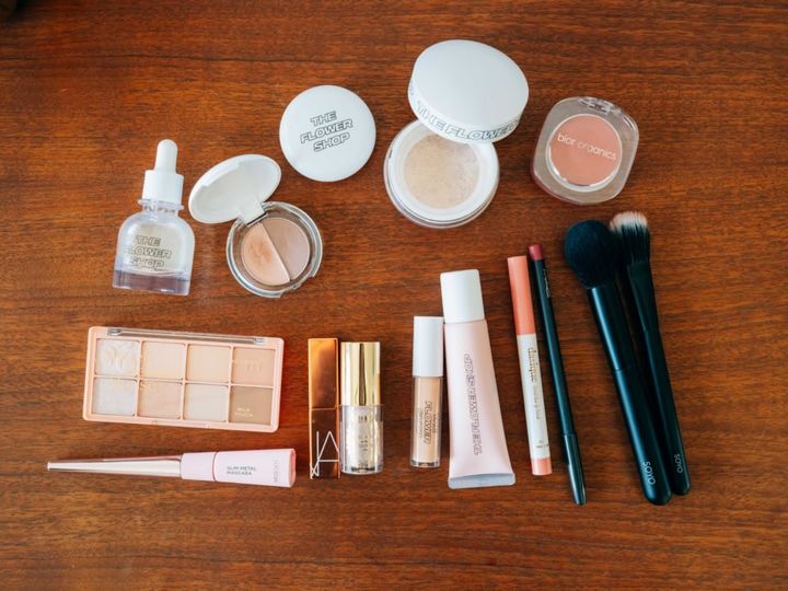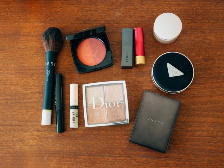 一軍アイテムを集めた晴美さんの毎日メイク。パーツを際立たせるアイテムづかいで全体をヘルシーな印象に。