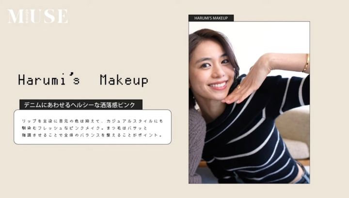 毎日はいているというデニムがお似合いの晴美さん。リップを主役にカジュアルスタイルにも合うフレッシュなピンクメイク。目元の色は抑えつつ、まつ毛はバサッと強調させることで、リップだけが浮かないようにバランスを。