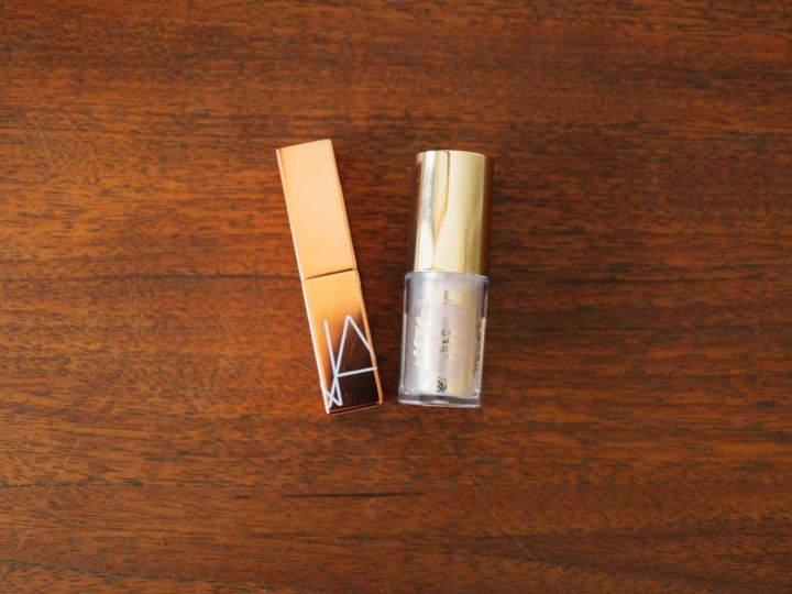 “レス感”でまとめたメイクの仕上げにはバームとグロスでツヤ感をプラス。ヌーディな色みに重ねてほどよい女っぽさを。