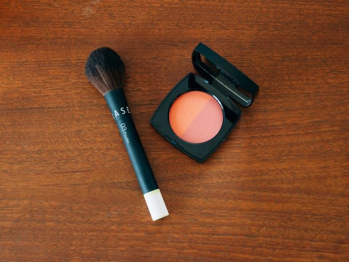 コーラル系のパウダーチークでピュアさを演出。大きめのブラシで広範囲にふわっと。
