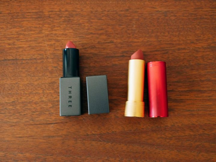 ポイントとなるリップは2つを重ねづけ。ピンク系の色味を軸に、マットなくすみカラーで深みを足して。