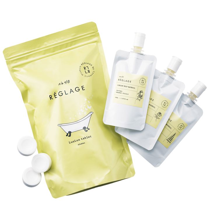 左:美容家の深澤亜季さんが香りを監修。レグラージュ No.48 ルンルン・タブレット 45錠 ¥3,960(桃谷順天館)
