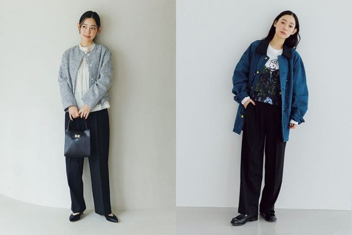 • シンプルなパンツだからこそ、ハレの日は高見えするツイードジャケットで華やかさをプラス。黒地のツイードなら、ユニクロのワイドタックパンツとも好相性です。