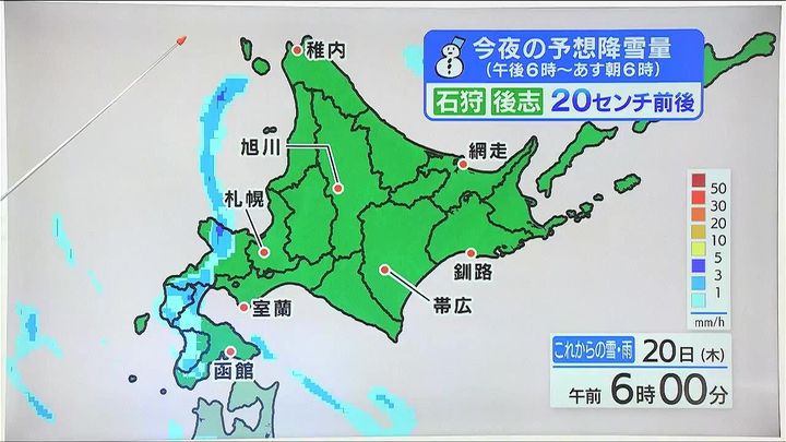 今日いっぱい札幌周辺など同じようなところで雪が続きますが、あすの午前は後志や道南が雪の中心に変わります。今夜も石狩、後志地方の多いところでさらに20センチ前後の雪が降りそうです。